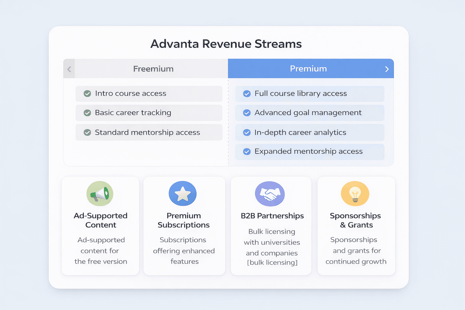 Advanta was designed to address a gap in the professional development space, where early-career professionals often lack structured guidance, mentorship, and clear growth pathways. Instead of a traditional networking platform, Advanta was positioned as a career roadmap that combines mentorship, goal progression, and practical career education in one product.